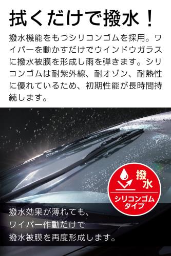 ※現車に装着されているワイパーの長さ・形状をよくご確認の上、同じ長さ・形状のワイパーをお買い求めください。※オプションなど純正エアロワイパー装着車には適合しない場合がございます。幅や形状を良くご確認の上ご購入ください。入数:1本乾拭き作動でカンタンに撥水コーティング!新開発の特殊ラバーにより、ワイパーを作動させることで、シリコンオイルがガラス面に付着し、撥水被膜をスピード形成します。(※撥水被膜の...
